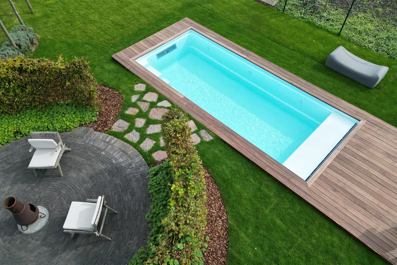 Dieser eingelassene Pool ist das sportliche Design in unserem Portfolio. Dank seiner kompakten und schlanken Größe passt er optimal in einen kleinen Garten. Eine zusätzlich eingebaute Gegenstromanlage lädt zum sportlichen Schwimmen ein – oder entspann dich einfach und lass dich im Wasser treiben, genieß das angenehme Leben in deinem Gartenparadies.